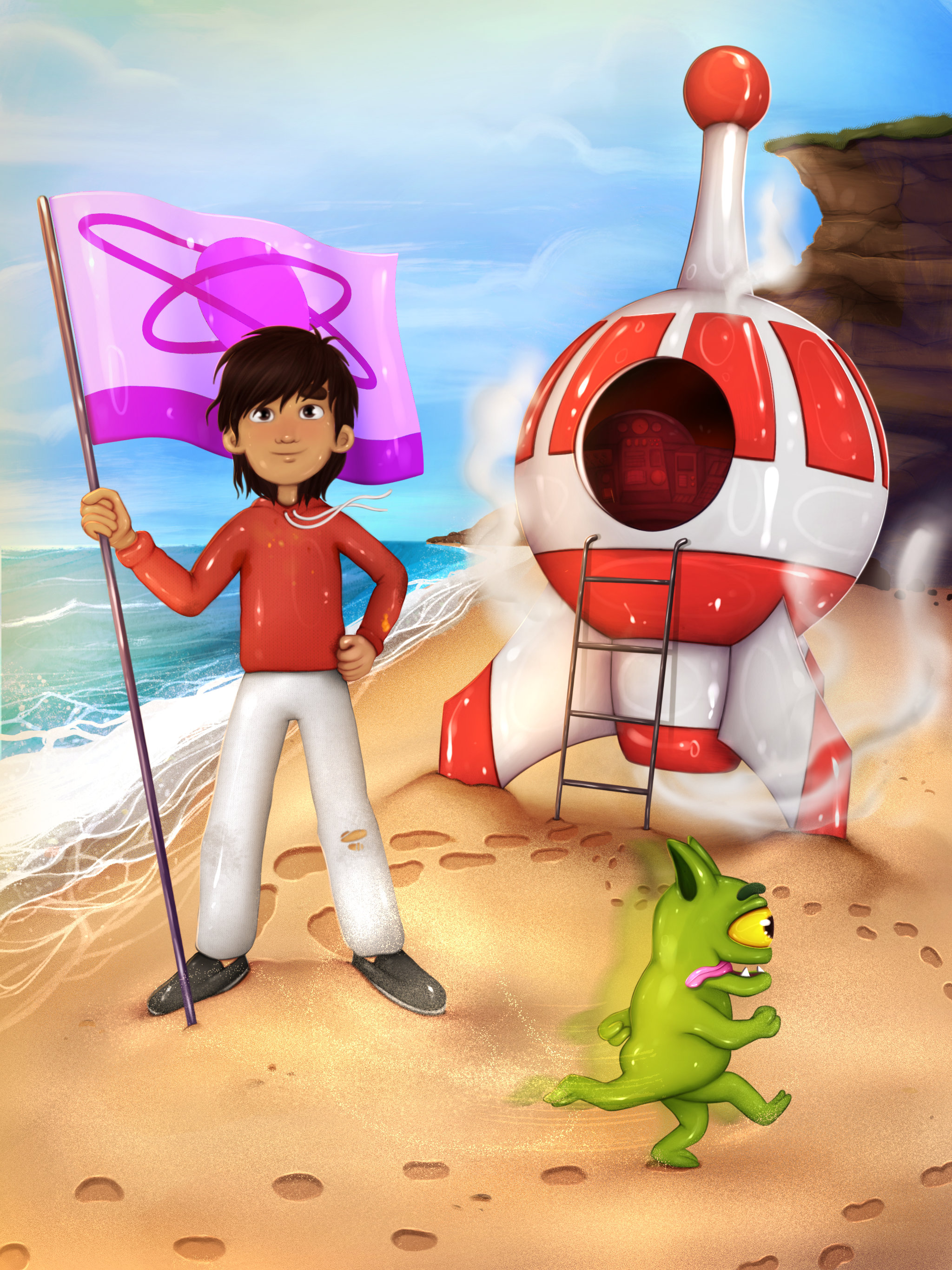 The low morning sun skimmed across the ocean swells. The greenish surf charged up the sandy beach with a foamy flourish, licked the lowermost fin of the rocketcraft, and scurried back to safety. The briny tang of the terrestrial sea tingled in his nose. The chilly breeze tousled his hair and rustled the flag.