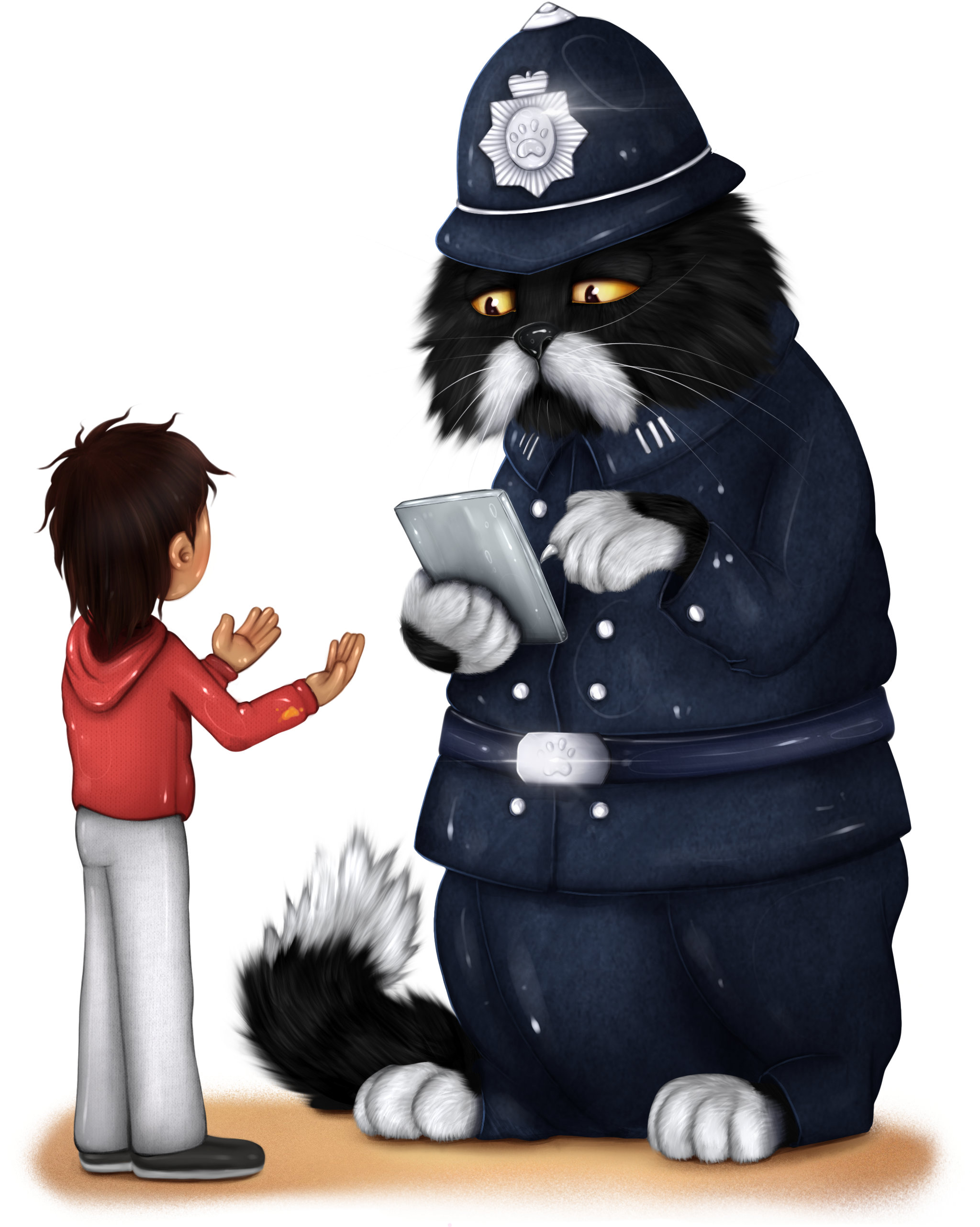 The two feline officers, dressed in dark blue uniforms with Tabbyton Police badges, donned their bobby helmets as they approached. Sergeant Tiger had short, orange tabby-striped fur, with dull hazel eyes that sharply conveyed his profound indifference. Constable Checkers had fluffy, long, black and white fur—mostly black on his face with white tufts protruding from his ears, and white across his muzzle, which looked comically like a mustache. His sloped, amber eyes appeared both sleepy and annoyed.