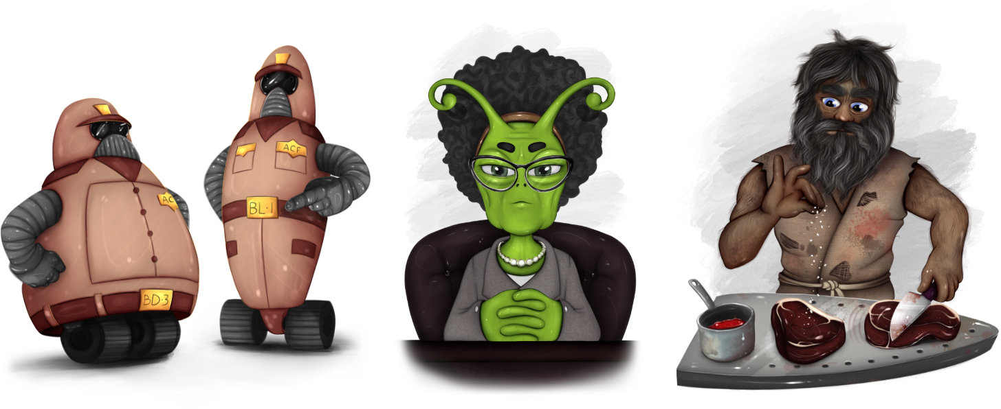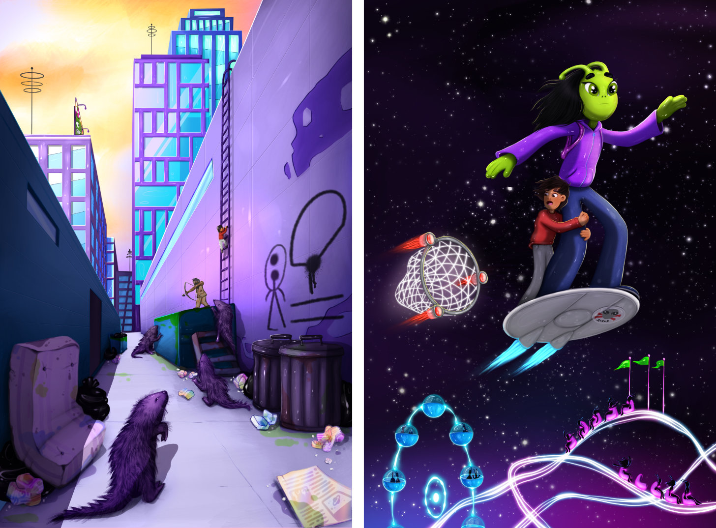 She decided her pet earthling would be a little young one while they’re still so cute and soft—before they turn big, hairy, and lumpy. She thought maybe she would get a girl earthie with long black hair like hers, and they could wear matching outfits, and she’d name her Mira, like “mirror”. Or Zirette. Or maybe a boy earthie with bright head-fur and speckles on his chubby cheeks, and she’d name him Figo. Or Brover. Or Gex. She wasn’t sure yet.