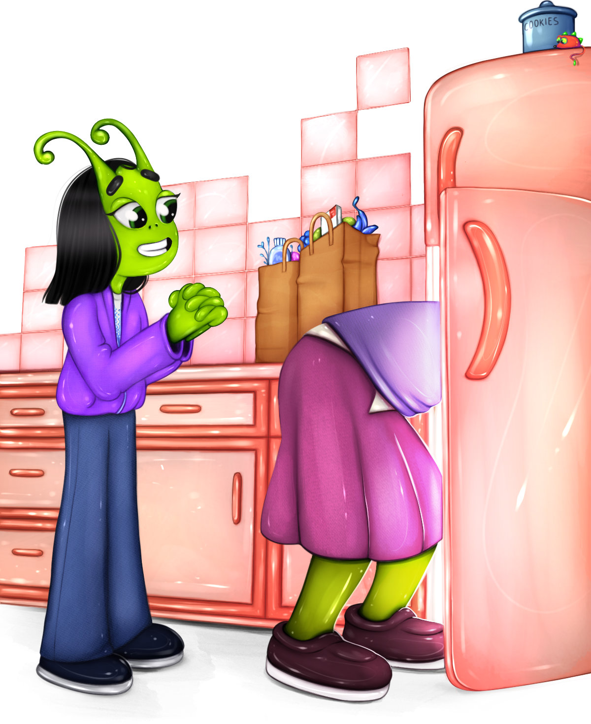 Zira’s mom pulled more groceries from the bag and leaned inside the refrigerator to cram the food on the shelves. “Earthlings are a lot of work, more than you think. And they make a big mess.”